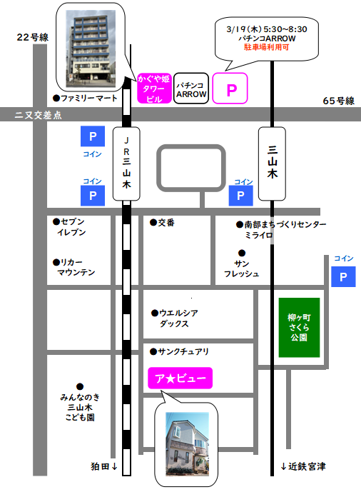 車でお待ちいただく場合は、かぐや姫タワービル隣のパチンコARROWの駐車場をご利用ください。